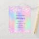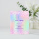 A girly and feminine Sweet 16 party invitation. On front: A rainbow, holographic coloured background in purple, pink, mint green. Decorated with blush pink confetti. Personalise and add a name and party details. The name is written with a hand lettered style script, purple coloured letters.