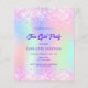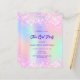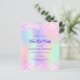 A girly and feminine birthday party invitation for a teen girl. On front: A rainbow, holographic coloured background in purple, pink, mint green. Decorated with blush pink sparkles. Personalise and add a name and party details. The name is written with a hand lettered style script, purple coloured letters.