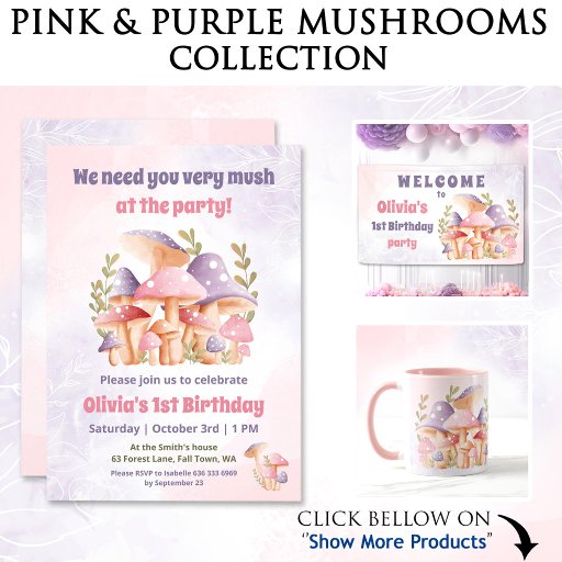 Pink Purple Mushrooms Fall 1st Birthday Banner