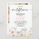 Pretty wildflowers birthday invitation for a little girl featuring a pale pink and purple floral base with a hint of blue and yellow. This our little wildflower first birthday invitation also features a modern calligraphy heading image, white butterflies and a photograph on the back.