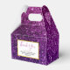 Wedding favour boxes with a fancy and elegant design. The background composed of pink and purple sparkling glitter gemstones. Trendy and feminine vibe. A rectangle with a faux-gold-foil border layered over top.