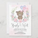 Invite your guests with this feminine baby shower invitation, featuring elegant greenery, watercolor florals in pink and purple and a cute baby bear holding two heart-shaped balloons. Use the design tools to edit the text, change font colour and style to create a unique one of a kind invitation design.
