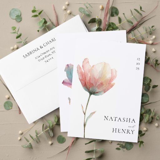 Elegant pink and purple tulip wedding invitations. Our modern collection features simple watercolor designs and minimalist typography for your spring or summer marriage celebration.