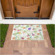 This Shabby Chic Floral door mat has pink flowers, yellow flowers, purple flowers, and red flowers on a field of green leaves.
