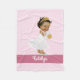 Princess baby girl nursery blanket in pink and white- Pink Moroccan quatrefoil lattice pattern with adorable, ethnic princess dressed all in white including slippers, a ruffled dress, gold tiara and matching jewellery with pearls. Add personalised baby girl's name in pretty white lettering on pink strip below. Irresistible, personalised girl baby shower gift or gift for newborn girl or for new parents that will become a keepsake.