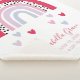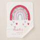 A beautiful, elegant rainbow baby keepsake birth stats sherpa baby blanket. This blanket features a beautiful, modern pink/pastel colour rainbow, showering hearts underneath it, and baby's name and birth stats in matching colours and hand lettered script typography. Makes a perfect gift for the new parents of a Rainbow baby, and is bang on trend for nursery decor for any new little one. Copyright Anastasia Surridge for Personalised Home Decor, all rights reserved.