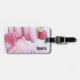 A luggage tag with a delicious photograph featuring a tower of pink macarons with raspberries placed around. Delightfully divine.
