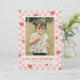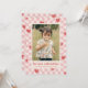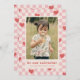 A festive Valentine's Day card with red hearts scattered over a pink chequerboard design. The message and customer information is placed beneath a large photo, and the back of the card features a coordinating pattern.