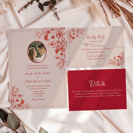 Pink Red Floral Photo Wedding Invitation