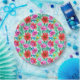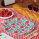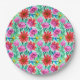 Birthday party paper plates pink, green, red and purple floral pattern.