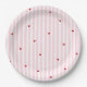 These little sweetheart baby shower paper platesadd a special, personalized touch to your Valentine's Day baby shower. The AIMEE Collection design features a white and light pink striped background with a wavy red border topped with a bow and red hearts.