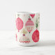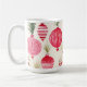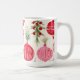 Think of Christmas and decorative tree ornaments come to mind. They look just right to decorate holiday coffee mugs. Here is a fun mug that features one of our original whimsical pink and red watercolor retro patterns. Fun sprays of holiday greenery accompany the retro images.