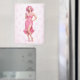 Add a splash of sweet retro charm to your fridge with this glamorous pink pin-up girl magnet. Featuring a vintage-inspired illustration of a stylish woman in a flowing pink dress holding a creamy milkshake, this design is set against a soft strawberry patterned background for a playful, feminine touch.
