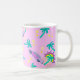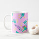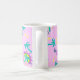 This pink coffee mug features fun retro themes such as palm trees, classic cars, stars, and a sunset.
