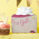 This sweet baby girl wrapping paper has a warm brown smokey rustic background. A wooden magenta rocking horse is featured as well as a white and beige teddy bear with a baby bottle. Customisable text reads, "It's a Girl!". Great for baby shower or new baby gift or decoration.