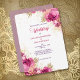 The top right corner of this bright and beautiful wedding invitation has an image of a pretty bouquet of pink and violet roses, along with some gold and green embellishments. Tiny gold confetti descends over the bouquet and runs onto the background. Your custom text is in matching pink and violet in the center. The bottom has a matching rose bouquet image at the left corner. The images and text are placed on an elegant white background. The back of the invitation is matching mauve violet, with the same confetti overlay. Beautiful, modern, and chic! The colors in this invitation are appropriate from spring through summer.