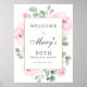 Welcome guests to your 90th birthday party with this elegant dusty blush pink and eucalyptus welcome sign. Your welcome statement is surrounded by a thin gold frame. Soft sage green eucalyptus leaves and large pink roses decorate it.