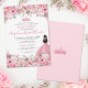 Happy Pink Roses Quinceañera Invitation. This adorable and girly design features a lively mix of happy pink roses and flowers in shades ranging from blush pink and pastel baby pink to bright, cheerful pinks, all accented with lush green leaves. The front showcases a bright pink sparkle princess tiara at the top, paired with elegant yet playful script and classic serif fonts in a mix of black and bright pink for a fun and stylish look. A beautifully illustrated girl in a bright pink sparkling dress adds a whimsical touch, making this invitation perfect for a princess-worthy celebration.