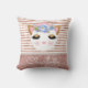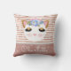 Pink rose gold kitty princess pillow. Pretty cat princess face in rose gold, blush pink and gold glitter, pink heart shaped nose and big golden glitter eye lashes, with a crown and pink and blue floral arrangement. Rose gold and white lines striped background with a pearl ribbon. Easily customise and add your name to personalise the pillow.