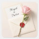 A delicate pink rose is elegantly placed on blank wedding stationery, including a red wax-sealed envelope.