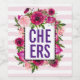 CHEERS wine bottle label. Designed with a floral bouquet composed of light pink roses and dark pink poppies with lots of lush green leaves. A frame layered over top to put your personalised text inside. The background is a soft pastel pink striped pattern.