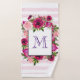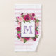 Monogrammed bath towel set with a floral bouquet composed of light pink roses and dark pink poppies with lots of lush green leaves. A frame layered over top to put your personalised monogram letter inside. The background is a soft pastel pink striped pattern.