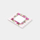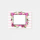 Sticky notes with a floral bouquet composed of light pink roses and dark pink poppies with lots of lush green leaves. A frame layered over top to write inside. The background is a soft pastel pink striped pattern.