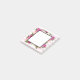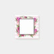 Small square sticky notes with a floral bouquet composed of light pink roses and dark pink poppies with lots of lush green leaves. A frame layered over top to write inside. The background is a soft pastel pink striped pattern.