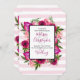 A wedding invitation with a floral bouqiet composed of light pink roses and dark pink poppies with lots of lush green leaves. A rectangle art deco frame layered over top to put your custom text inside. The background is a soft pastel pink striped pattern.