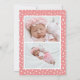 Elegant cute birth announcement template card featuring \illustrations of red watermelon and pomegranate fruit with floral light blush pink roses, lavender and green foliage on the front. The back reveals a coral pink polka dot background. There are 3 pictures of your newborn that can be added on this card (front and back). Perfect card to announce the arrival of your new baby with his/her birth stats. Great for both baby boy and girl. Perfect for summer and spring seasons!