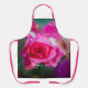 Apron featuring a photo of a big pink rose with snowflakes on dark green background.
