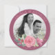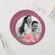 Pretty pink watercolor rose bouquet wreath photo wedding save the date announcement card (round). This photo wedding save the date announcement card is lovely for a spring or summer wedding. Watercolor pink rose with greenery and other flowers. Personalised with your names and your engagement photo. Additional wording on the back.
