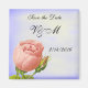 A Save the Date magnet with script letters and room for your custom text, decorated with a pretty pink rose with a small rosebud just starting to open on a cream and sky blue background.