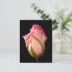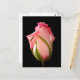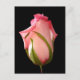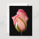 Beautiful greeting card with a closeup of a pretty pink rosebud on a black background. Digital photography by Sue Melvin