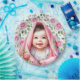 Cute girl's baby shower paper plates. Adorable baby with black hair and blue eyes smiling under a pink rosebuds blanket. A background of pink roses and green foliage.