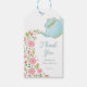 Gift Tag featuring a border of pink flowers and greenery flowing from a cute teal blue whimsical teapot. Customise with your information. Click "click to customise further" to change the font style, size or colour.