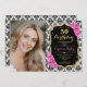 Elegant floral feminine 50th birthday invitation with your photo. Glam black white pink design with faux glitter gold. Features black and white damask pattern, pink roses, script font and confetti. Perfect for a stylish adult bday celebration party. Personalise with your own details. Can be customised for any age! Printed Zazzle invitations or instant download digital printable template.
