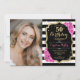 Elegant floral feminine 50th birthday invitation with your photo. Glam black white pink design with faux glitter gold. Features black and white stripes, blush pink roses, script font and confetti. Perfect for a stylish adult bday celebration party. Personalise with your own details. Can be customised for any age! Printed Zazzle invitations or instant download digital printable template.