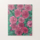 Jigsaw puzzle featuring delicate floral art, blooming rose flowers in a garden. Pink, rose, mint and emerald green colors.