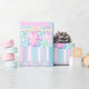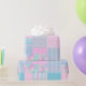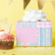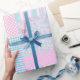 A roll of pretty and feminine Wrapping Paper, with a Faux Patchwork pattern of bright pink roses on a sky blue background, dotted with little white butterflies, teamed with matching Check Ginghams, Polka Dots and Striped Patterns. Part of the Posh & Painterly 'Summer Days' collection.