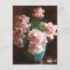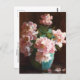 A fine art postcard with the painting by the American artist Charles Courtney Curran (1861-1942), titled Pink Roses. A turquoise vase with a lovely bouquet of flowers.