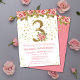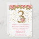 Pink Roses Floral 3rd birthday party invitation for a 3 year old girl with modern script writing and gold glitter.