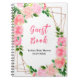 This beautiful and elegant baby shower guest book features watercolor pink roses and foliage on a gold geometric frame. The text combines handwritten script and serif fonts for a stylish and modern look. This is perfect for a spring or summer rustic baby shower.