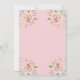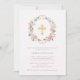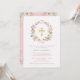 This beautiful first Holy Communion invitation features a wreath of lovely pink watercolor roses with green leaves and faux rose gold accents, and a faux gold cross in the centre. The back of the card is a soft pink colour with matching floral bouquets in the corners.