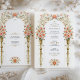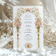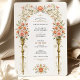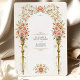This sophisticated Victorian-inspired wedding invitation features a stunning arrangement of soft pink roses, delicate floral vines, and elegant golden urns. The intricate arch design, adorned with subtle butterfly accents and golden filigree, creates a refined and romantic aesthetic. The cream background enhances the timeless charm, making this invitation perfect for couples seeking classic and luxurious wedding stationery with a floral theme.
