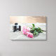 pink rose bouquet in beach sand with retro camera and sunbeams