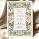 Step into the enchanting world of Art Nouveau with this romantic wedding invitation, perfect for heralding your special day. The front of the card is adorned with a symphony of pink roses, intricately intertwined with sage green and soft olive foliage, framed by the ornate, sinuous lines characteristic of the Art Nouveau style. A delicate ivory background enhances the softly blushing petals and golden accents, capturing the whimsy and organic forms popular in the period's graphic arts. The elegant typography in hues of forest green and sepia adds a touch of sophistication. The reverse is tastefully simple, showcasing an ornamental monogram in coordinating colours. This invitation is a tribute to the art of Alphonse Mucha, capturing the essence of an era that celebrated beauty and nature in every curve and colour.