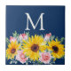 Pink Roses Sunflowers Navy Blue Monogrammed Tile