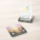 This coaster features a watercolor painting of pink roses at sunset. The image features pink roses in full bloom and as buds, with green leaves and stems. The roses are painted in shades of pink, from light rose to rose pink. The background shows a golden-yellow meadow stretching towards a pink, yellow, lavender and purple sunset sky. The sky has ethereal brushstrokes in pink, purple and yellow, creating a dreamy atmosphere. The coaster is a square hard plastic coaster with a cork backing. The coaster set contains six plastic coasters with cork backings.