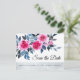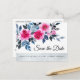 Elegant Save The Date postcard design featuring bright pink watercolor roses, blue and grey foliage on a white background.